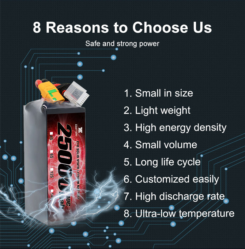 Di Zye, kami tidak hanya membangun baterai; Kami sedang membangun kepercayaan. Dengan lebih dari satu dekade pengalaman dalam industri baterai lithium, kami telah mengasah keahlian kami untuk memberikan produk yang melebihi harapan. Salah satu produk tersebut adalah milik kamiKepadatan energi tinggi 22Ah 20Ah 22000mAh 10c 20c Solid State Li-Ion Battery Pack Untuk Drone Jangka Panjang, dirancang untuk efisiensi dan daya tahan maksimum dalam aplikasi yang menuntut.